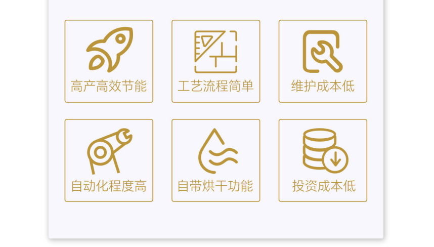 優(yōu)勢(shì)特點(diǎn):、高產(chǎn)高效節(jié)能、工藝流程簡(jiǎn)單、維護(hù)成本低、自動(dòng)化程度高、自帶烘干功能、綜合投資成本低