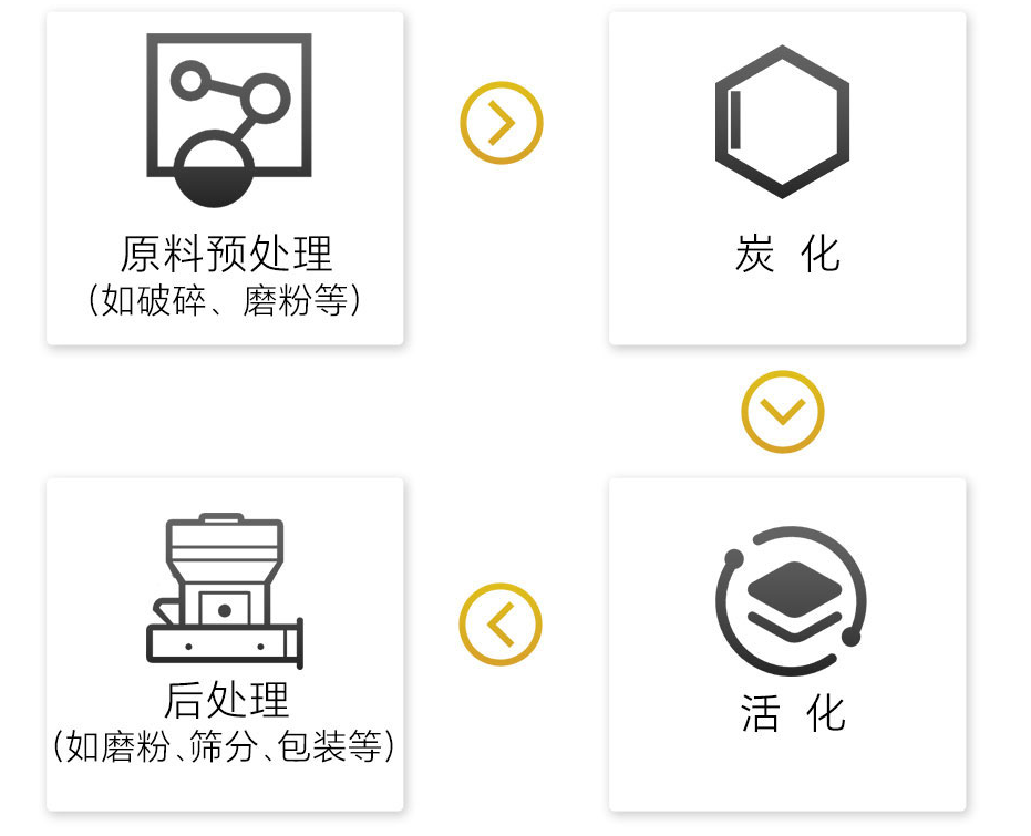 (一)、活性炭生產(chǎn)常見流程:原料預(yù)處理(如破碎、磨粉等)→炭化→活化→后處理(如磨粉、篩分、包裝等)
